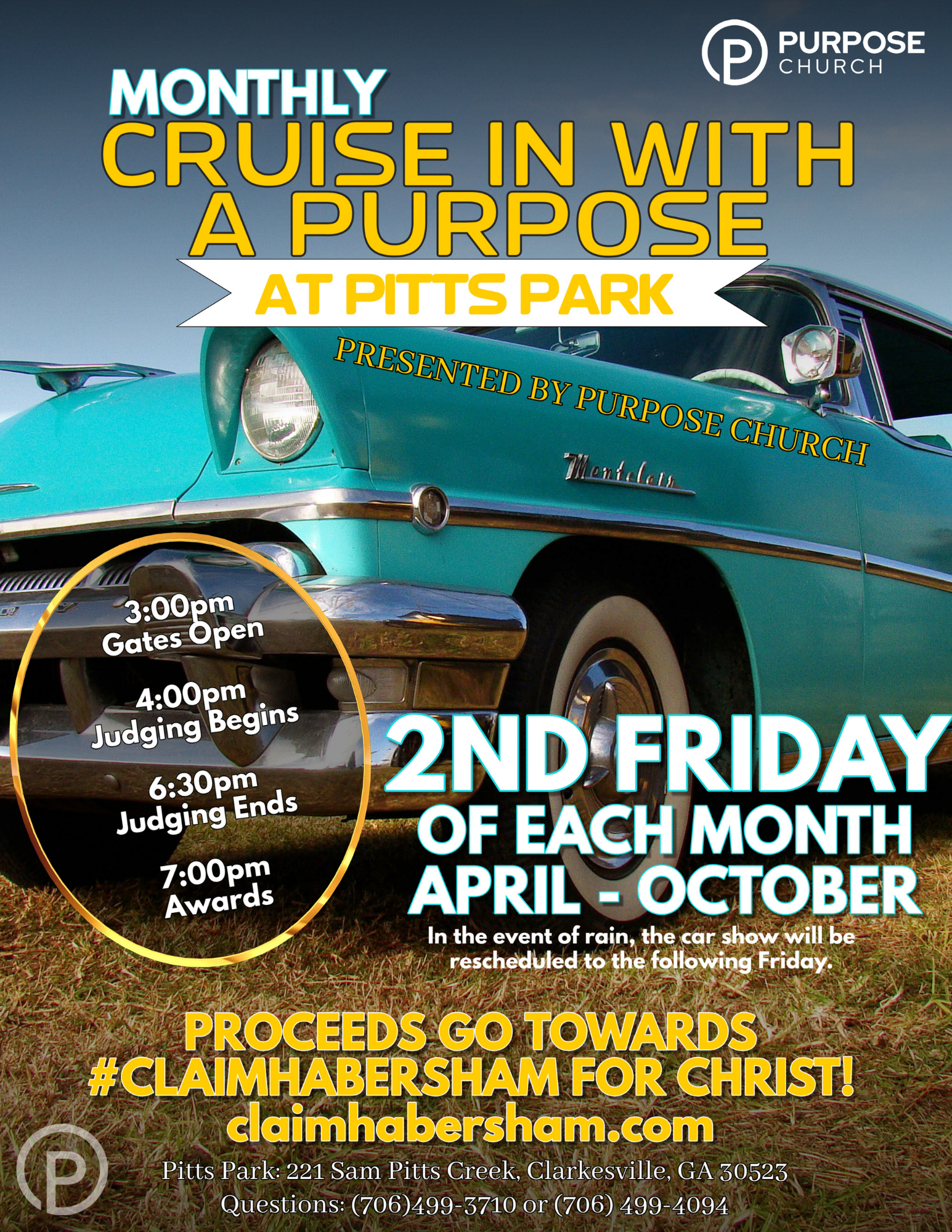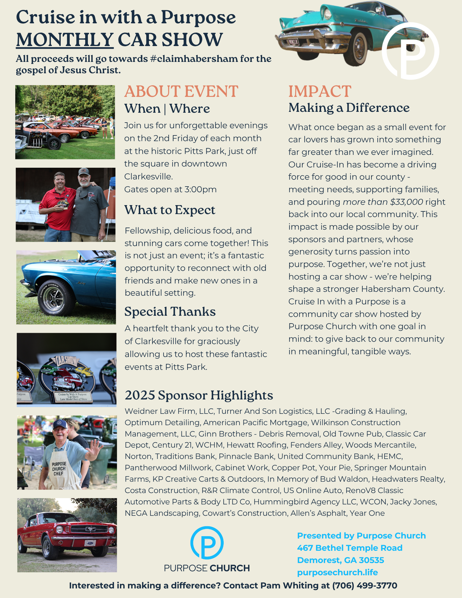 What once began as a small event for car lovers has grown into something far greater than we ever imagined. Our Cruise-In has become a driving force for good in our county - meeting needs, supporting families, and pouring more than $33,000 right back into our local community. This impact is made possible by our sponsors and partners, whose generosity turns passion into purpose. Together, we’re not just hosting a car show - we’re helping shape a stronger Habersham County. Cruise In with a Purpose is a community car show hosted by Purpose Church with one goal in mind: to give back to our community in meaningful, tangible ways.